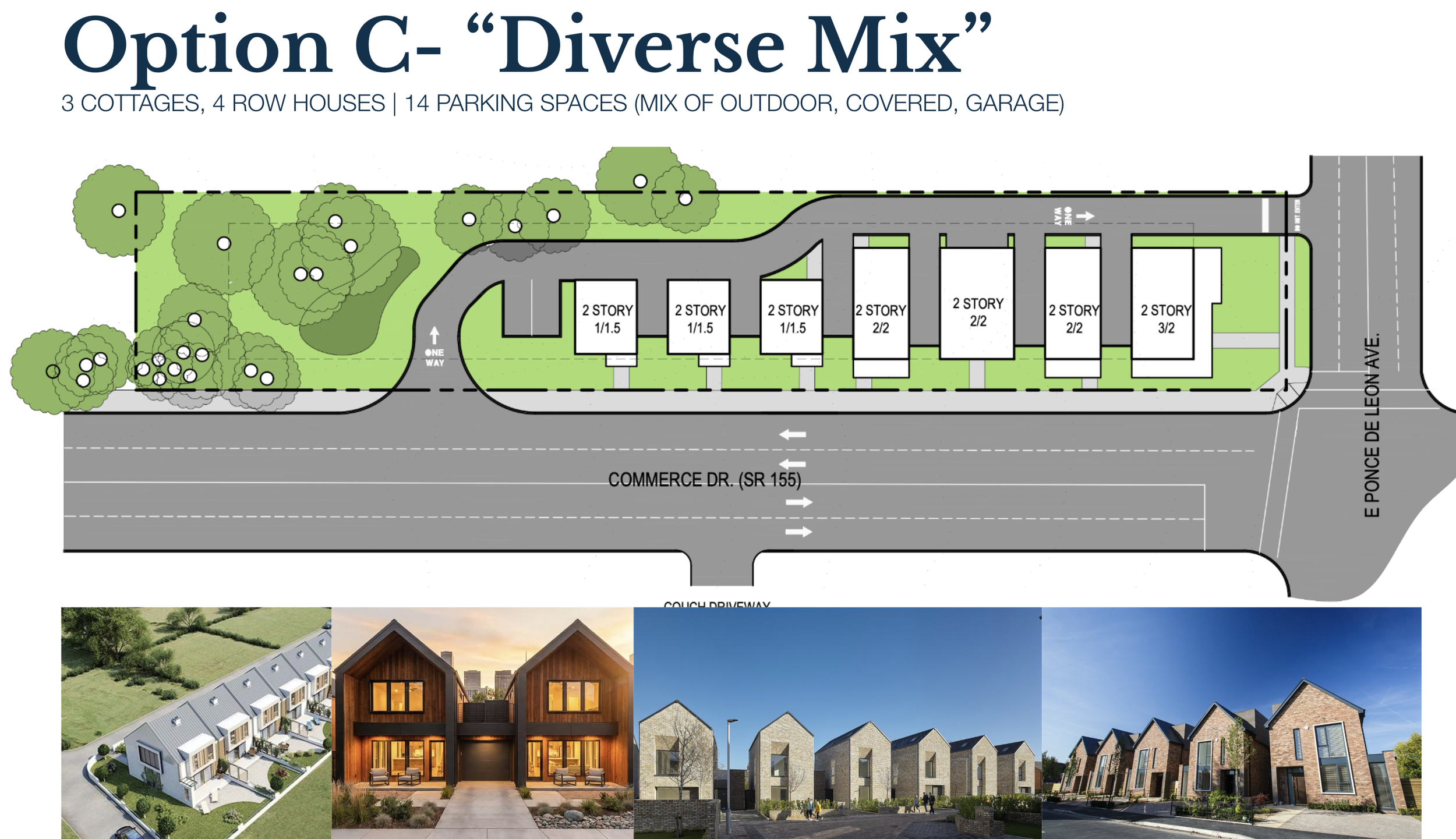 Diverse Mix: A hybrid of cottages and row homes, offering a range of housing types and price points to serve a broader mix of residents.