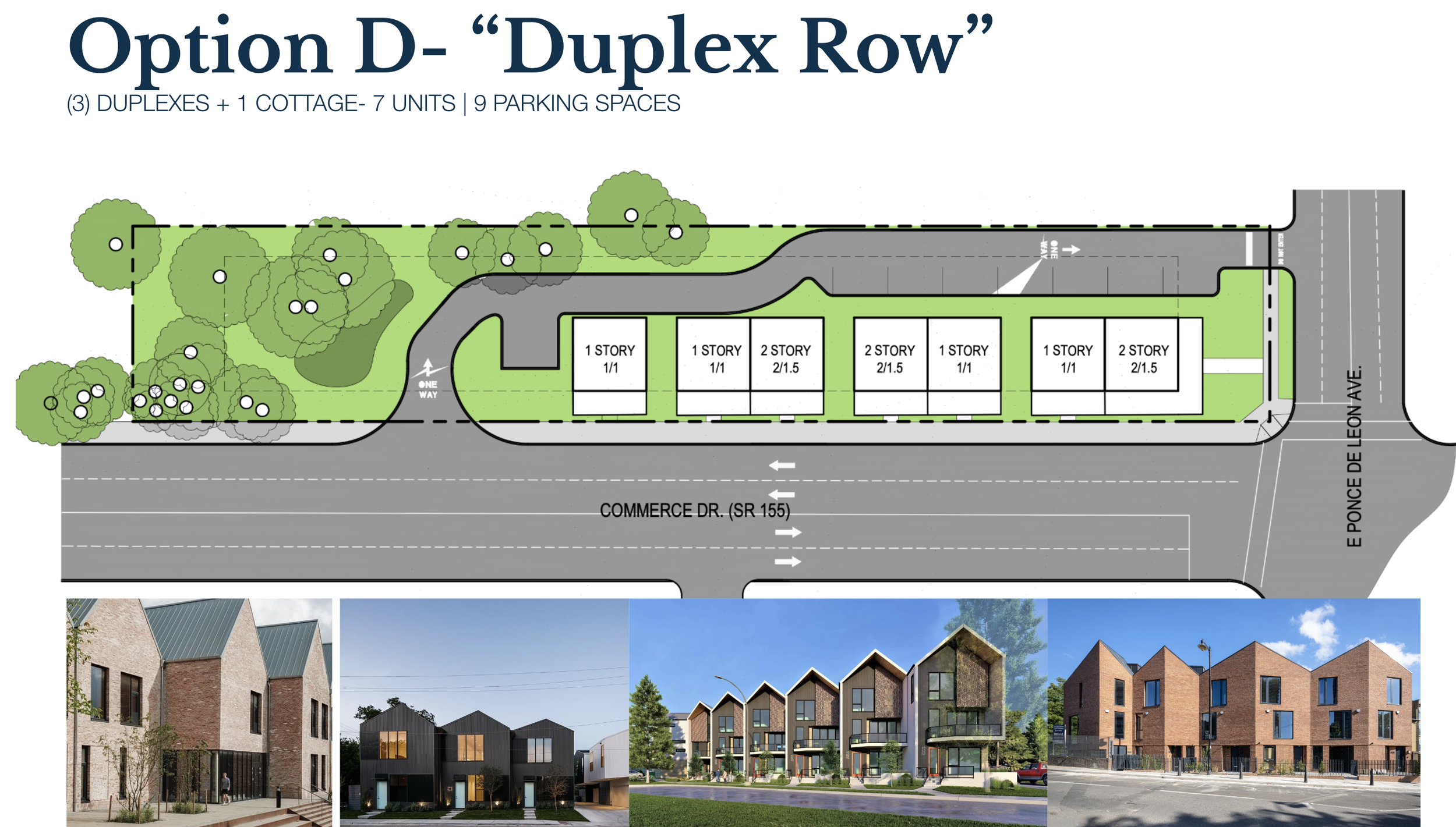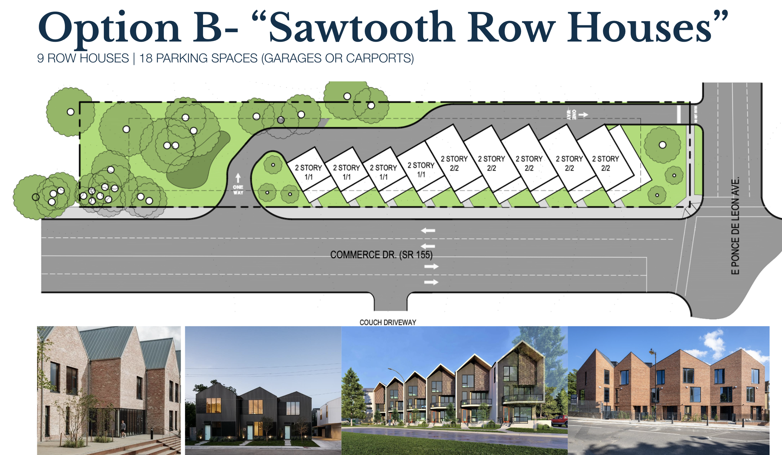 Sawtooth Row Houses: A more compact, urban approach that introduces up to nine attached homes with integrated parking, maximizing efficiency on the site.